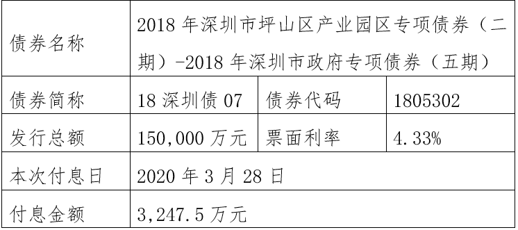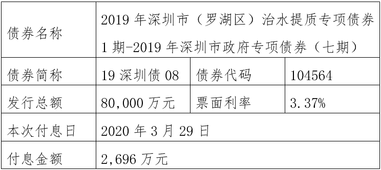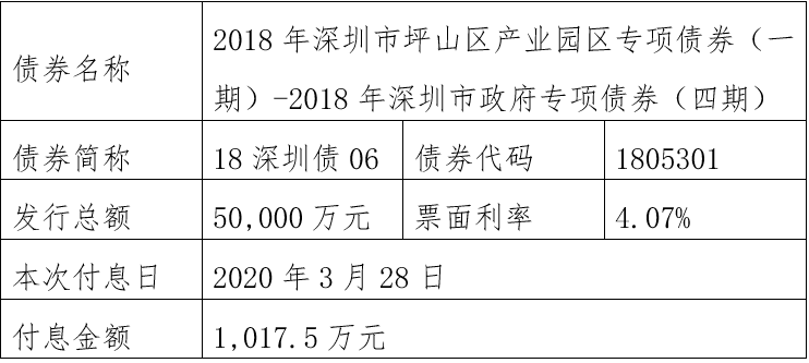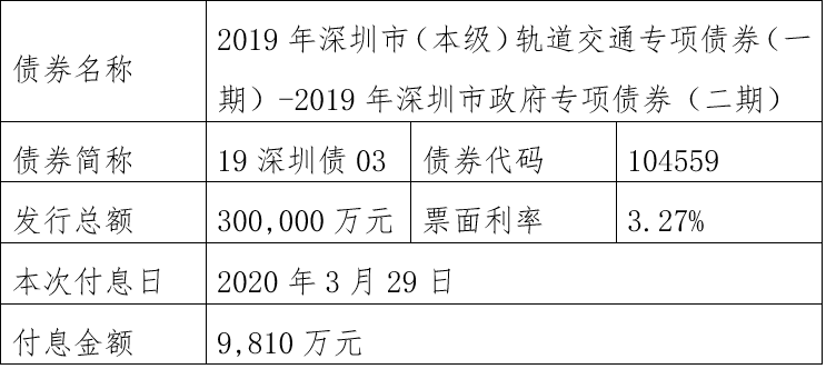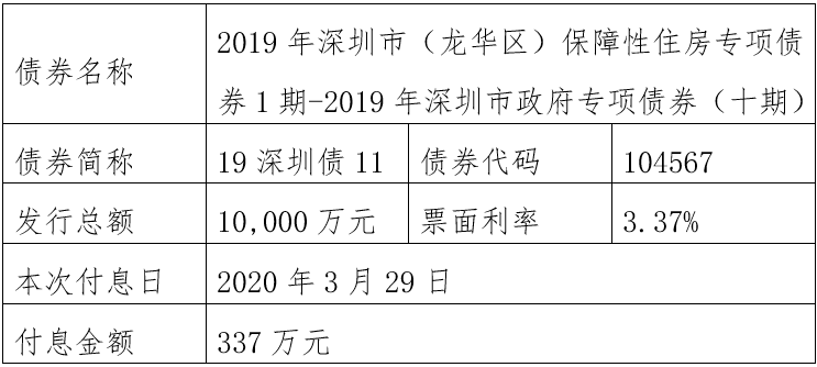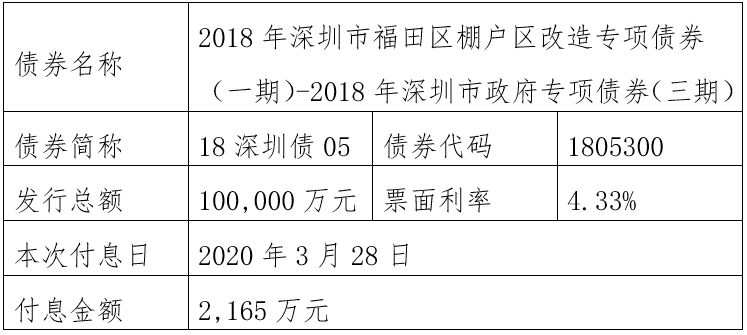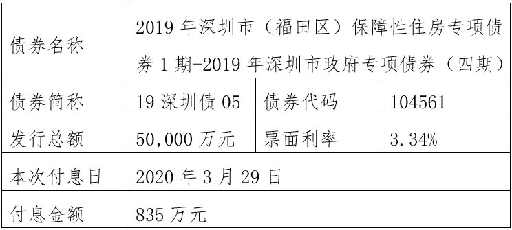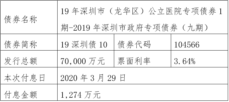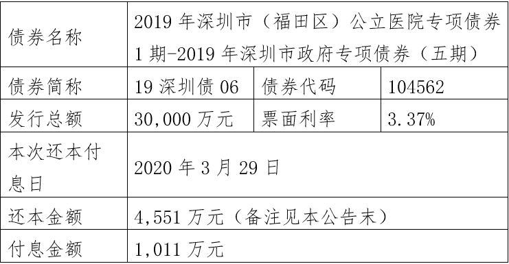 注:由于2019年深圳市(福田区)公立医院专项债券1期-2019年深圳市政府专项债券(五期)(债券简称:19深圳债06,债券代码:104562)原定2020年至2025年每年3月29日还本金额4550万元占发行总额30,000万元的比例为无限循环小数(4550÷30000=0.151666……),需要调整还本金额。为此,该债券将采用减少面值方式部分兑付,2020年至2025年每年3月29日还本金额调整为4551万元,最后一期2026年3月29日还本金额调整为2694万元,此债券以后年度将直接公告调整后的还本金额,不再另行备注。